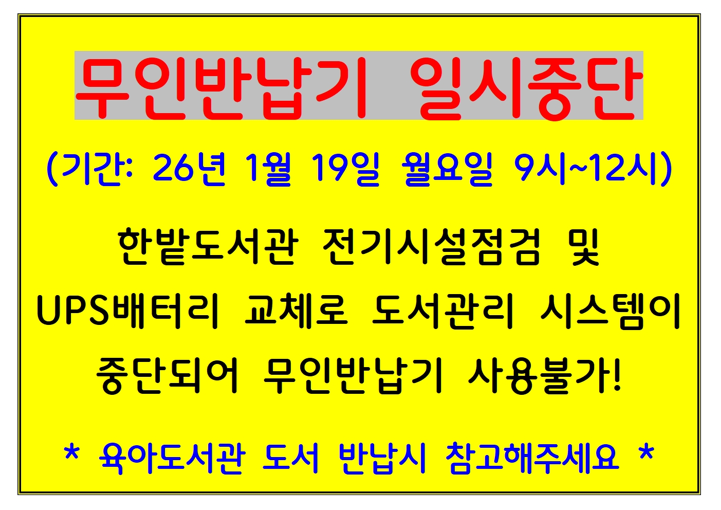 무인반납기 일시 중단 안내 - 책마루 육아도서관-