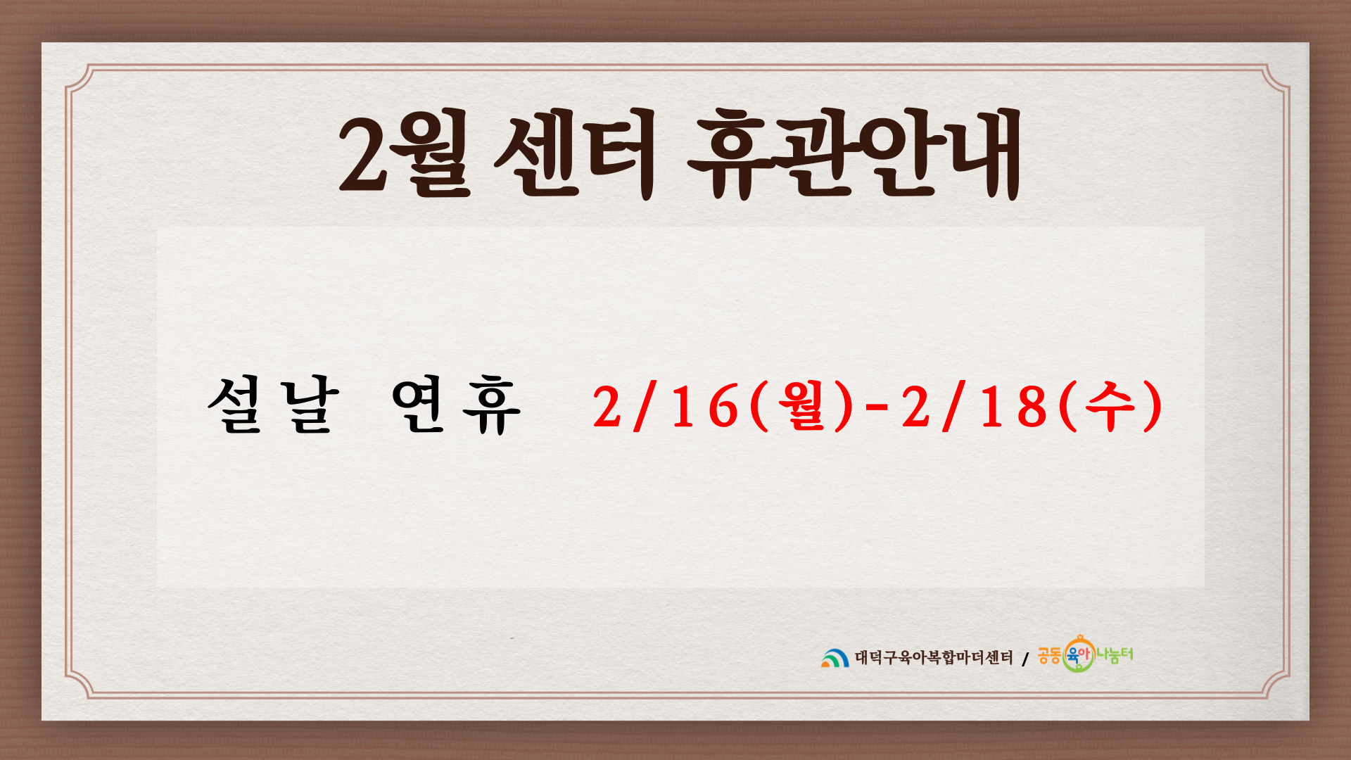 2월 마더센터 휴관일을 다음과 같이 공지하오니, 이용에 참고하여 주시기 바랍니다.