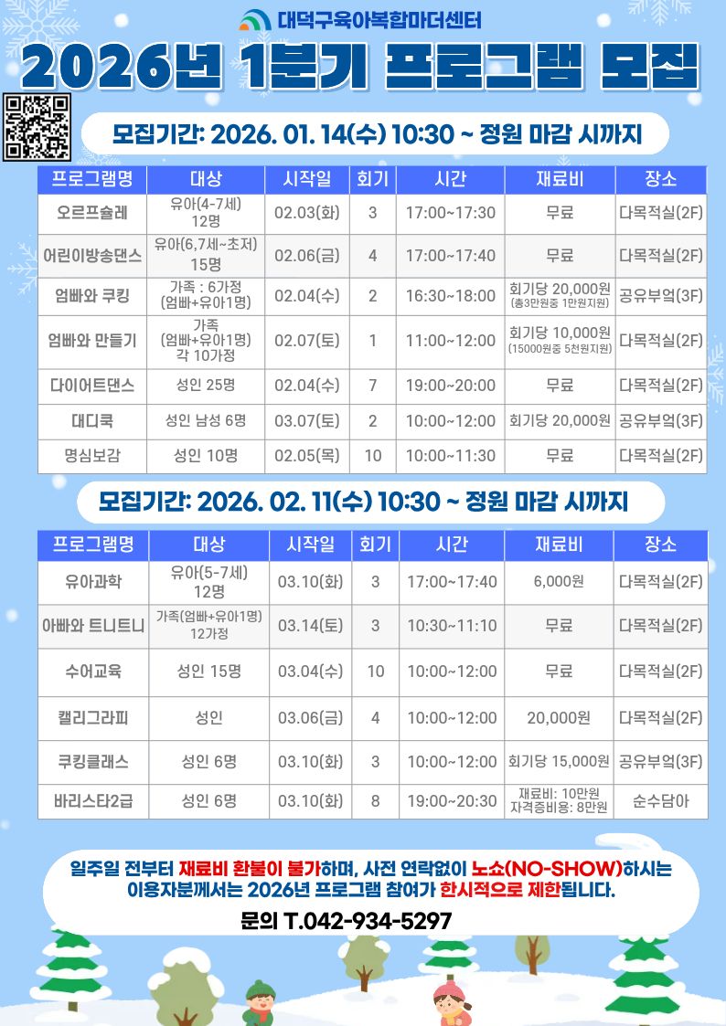 2026년 1분기 프로그램 모집 계획(안) 공고드리오니, 이용자분들께서는 위 포스터를 참고하시어, 많은 신청하여 주시기 바랍니다.