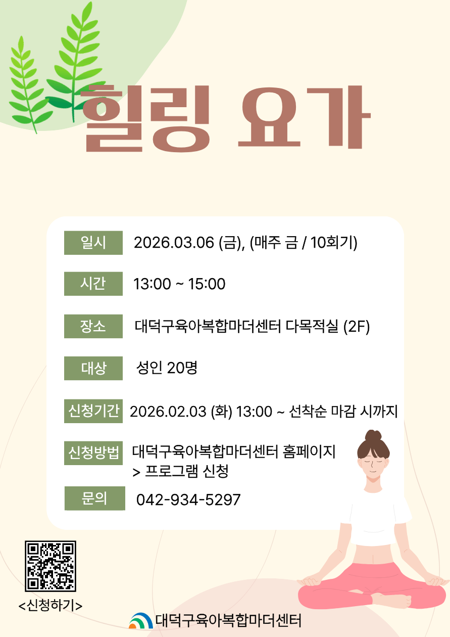 대덕구평생학습원에서 진행하는 '힐링요가' 프로그램이 강사 및 담당자 요청으로 인해 모집시기가 변동됨을 안내드리며,